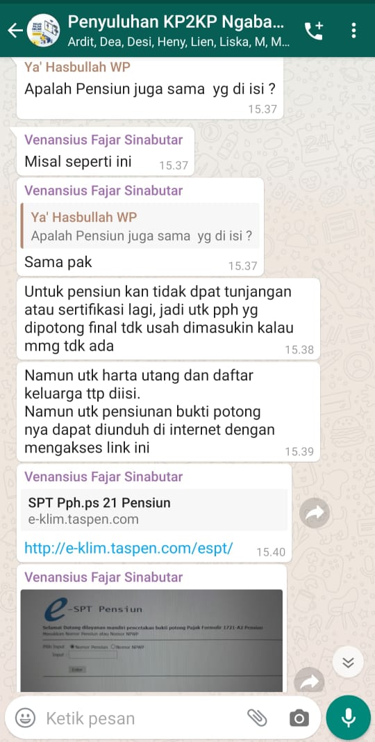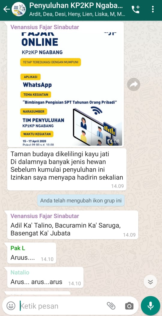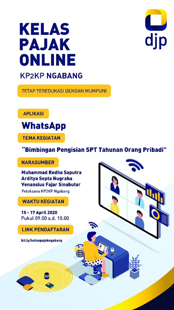 Kantor Pelayanan, Penyuluhan dan Konsultasi Perpajakan (KP2KP) Ngabang mengadakan kelas pajak daring melalui Whatsapp (Jumat, 17/4). Kegiatan ini bertujuan untuk membimbing dan memberi edukasi perpajakan perihal pengisian SPT Tahunan melalui e-Filing di tengah Pandemi Covid-19 ini. Peserta kegiatan ini merupakan ASN yang bertugas di Landak.