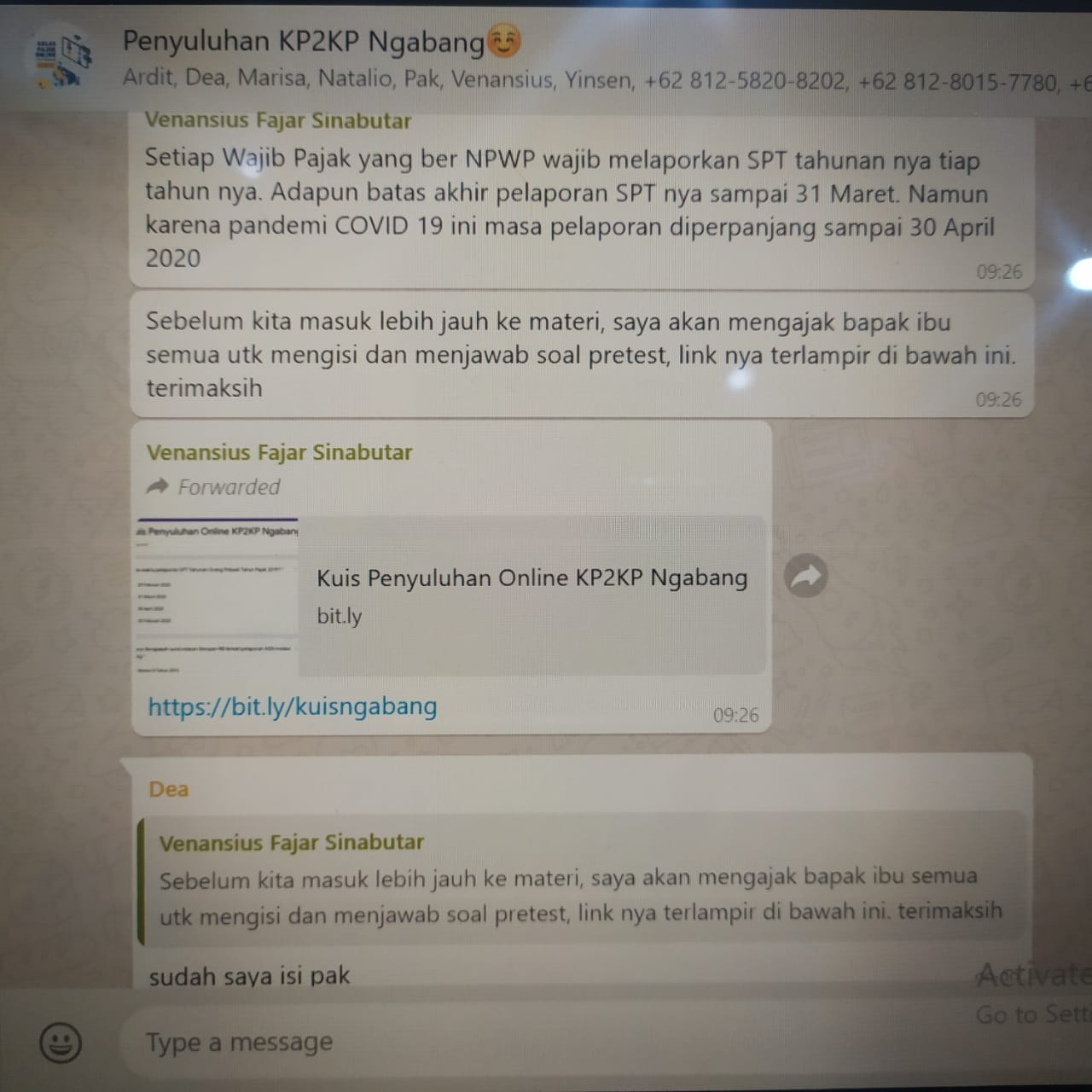 Kegiatan edukasi ini dibawakan oleh Venansius Fajar Sinabutar selaku Tenaga Penyuluh KP2KP Ngabang. Kegiatan yang berlangsung dari pukul 09.00 sd 10.00 ini berjalan lancar dari penjelasan materi, pemberian bimbingan pengisian e-Filing, dan sesi tanya jawab. "E-Filing itu ternyata mudah,'' ujar Gabriella, peserta kelas pajak daring melalui pesan Whatsapp