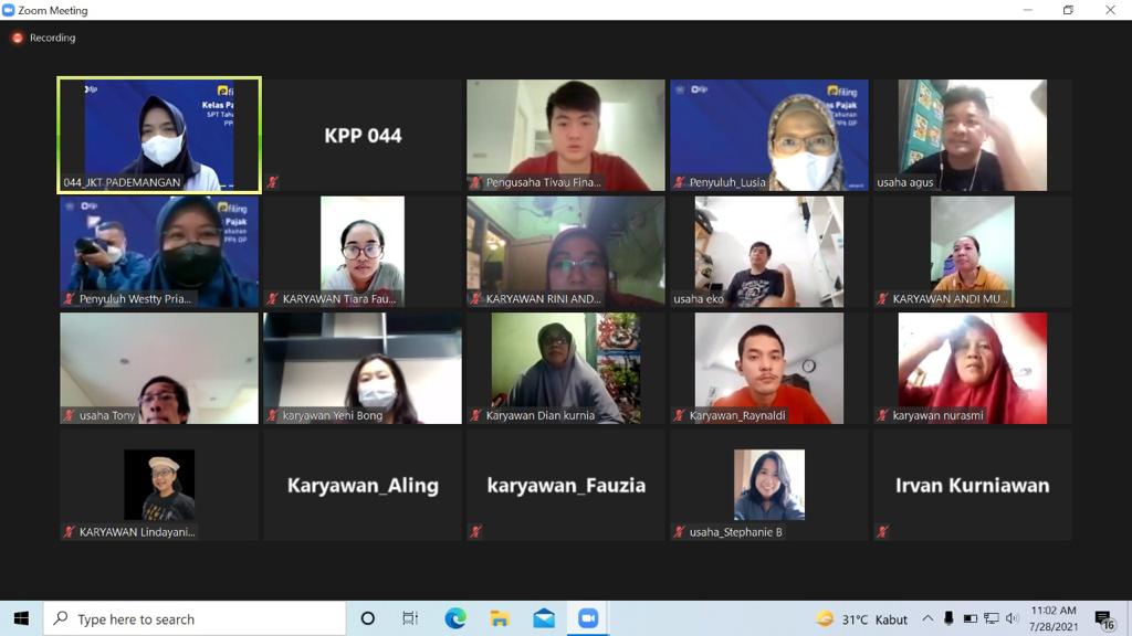 Kelas pajak daring dengan tema Pengisian SPT Tahunan PPh Wajib Pajak Orang Pribadi (WP OP) bertujuan meningkatkan pengetahuan dan pemahaman wajib pajak terkait tata cara pelaporan SPT Tahunan PPh khususnya WP OP serta hak dan kewajiban perpajakan yang menyertainya. Kelas pajak diikuti 28 peserta karyawan dan non karyawan di wilayah Kecamatan Pademangan.