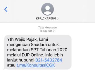 Isi dari pesan singkat ini berupa “Yth Wajib Pajak, kami mengimbau Saudara untuk melaporkan SPT Tahunan 2020 melalui DJP Online. Info lebih lanjut hubungi 021-5402764 atau t.me/KonsultasiCGK”. KPP Pratama Jakarta Cengkareng telah mengirimkan 7524 SMS Blast kepada Wajib Pajak Orang Pribadi yang belum menyampaikan SPT Tahunan 2020.