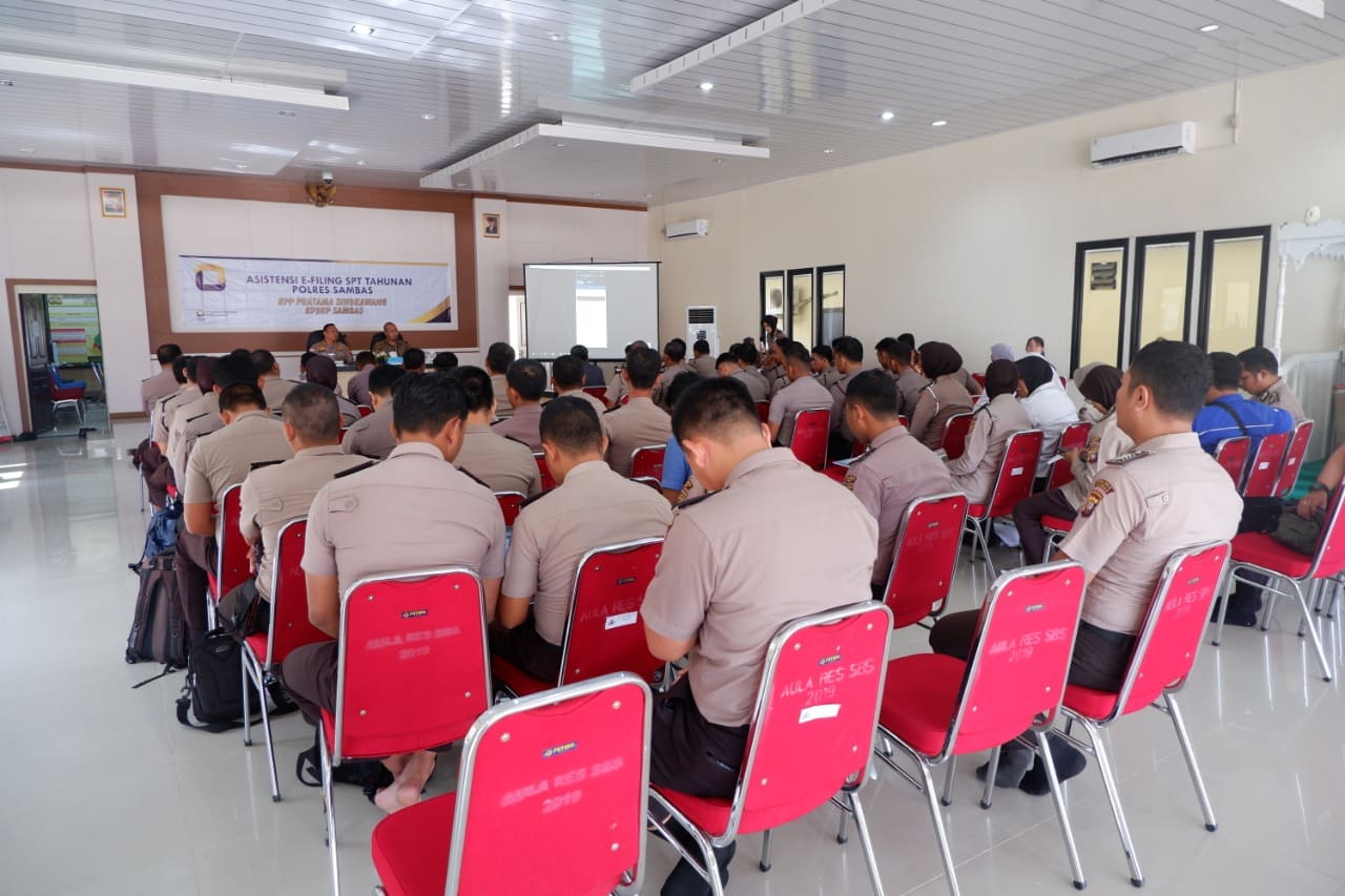 Kantor Pelayanan Penyuluhan dan Konsultasi Perpajakan Sambas memenuhi undangan Kepolisan Resor Sambas untuk memberikan edukasi pelaporan SPT Tahunan PPh melalui e-Filing di Aula Dhira Wijaya Polres Sambas (Selasa, 25/2).