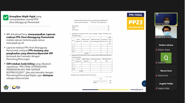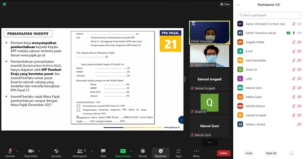 Kantor Pelayanan, Penyuluhan, dan Konsultasi Perpajakan (KP2KP) Tomohon mengadakan kegiatan dialog dan edukasi perpajakan terkait perpanjangan insentif dan fasilitas perpajakan dalam penanganan Covid-19 secara daring di Kota Tomohon (Rabu, 18/8).