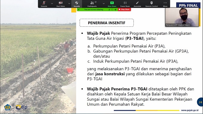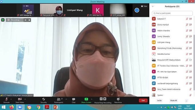 Kantor Pelayanan Pajak Madya Batam mengadakan sosialisasi PMK-83/PMK.03/2021 tentang Perpanjangan Insentif Perpajakan dalam rangka Penanganan Covid-19 secara daring kepada wajib pajak melalui Zoom Cloud Meeting di Batam, Kepulauan Riau (Rabu, 28/7).