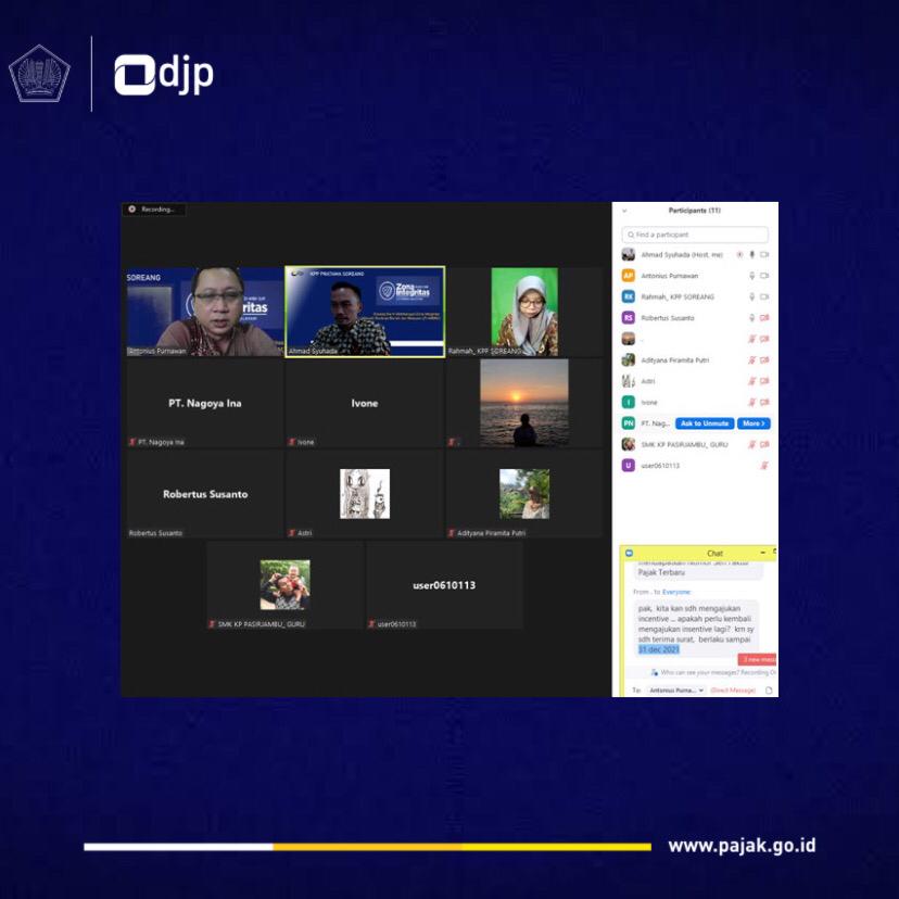 Kantor Pelayanan Pajak (KPP) Pratama Soreang mengadakan kelas pajak daring membahas PMK-82/PMK.03/2021 tentang Insentif Pajak untuk Wajib Pajak terdampak Covid-19 Insentif Pajak Diperpanjang, di Soreang (Jumat, 13/8). Kegiatan ini bertujuan untuk mengedukasi wajib pajak agar memanfaatkan fasilitas insentif pajak yang berlaku sampai 31 Desember 2021.