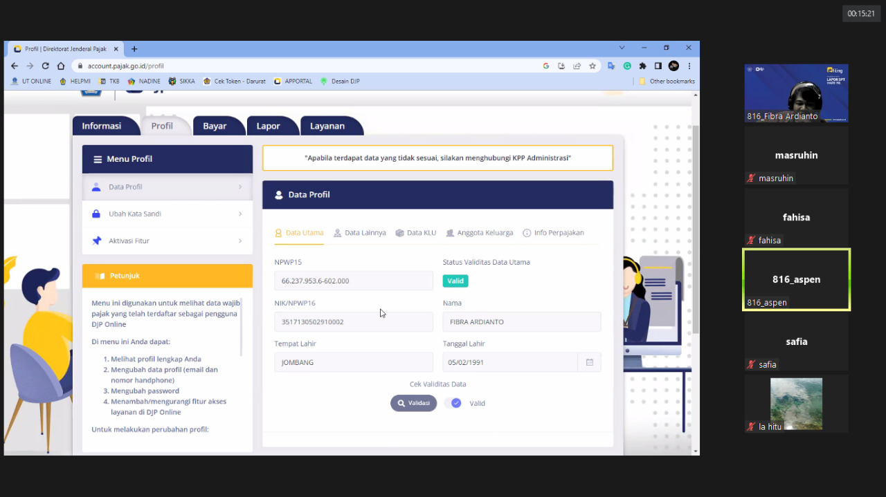 Kegiatan ini dilakukan dalam rangka mempercepat implementasi NIK sebagai NPWP sebagaimana tercantum dalam Peraturan Menteri Keuangan (PMK) Nomor 112/PMK.03/2022. Edukasi dilakukan secara daring menggunakan media zoom meeting. Fibra Ardianto selaku Penyuluh Pajak KPP Pratama Baubau memberikan penjelasan dan proses pemutakhiran data NIK secara mandiri melalui djponline.
