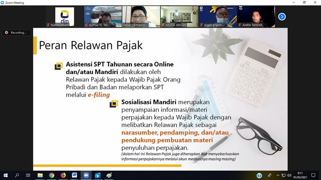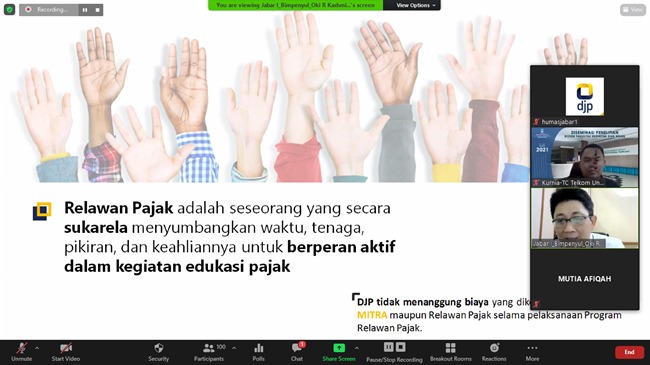 Kanwil DJP Jawa Barat I mengadakan kegiatan Bimbingan Teknis (Bimtek) Relawan Pajak Telkom University (Tel-U) secara daring di Bandung (Senin, 1/3). Telkom University (Tel-U) telah bekerja sama dengan Kanwil DJP Jawa Barat I dengan membentuk Tax Center di Kampus Tel-U. Pembentukan tax center ini sebagai landasan edukasi perpajakan dan penyebarluasan informasi perpajakan kepada mahasiswa dan masyarakat. Salah satu bentuk kegiatannya adalah dengan pelibatan mahasiswa dalam Program Relawan Pajak 2021.