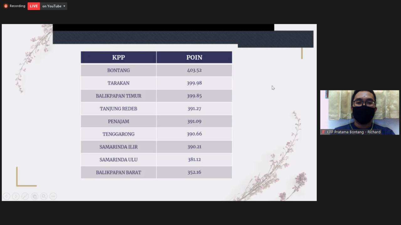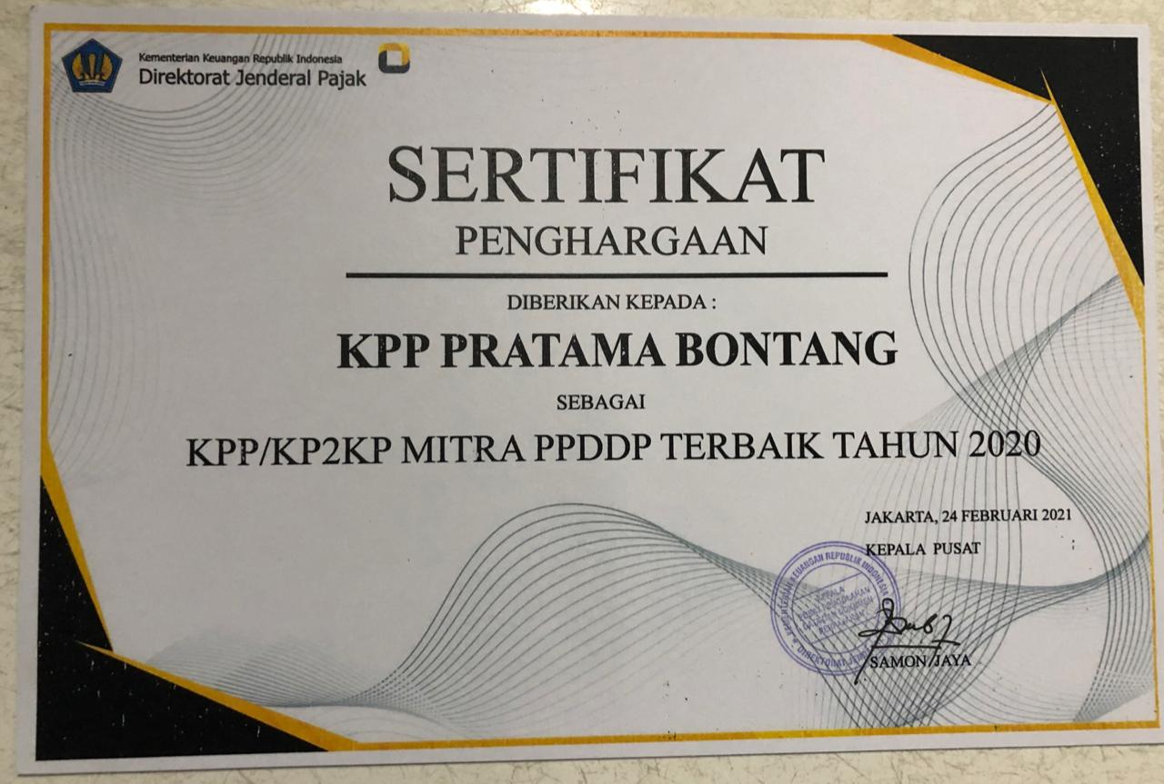 Kantor Pelayanan Pajak (KPP) Pratama Bontang menerima penghargaan sebagai KPP/KP2KP mitra Pusat Pengelolaan Data dan Dokumen Perpajakan (PPDDP) Terbaik tahun 2020 se-Kantor Wilayah DJP Kalimantan Timur dan Utara secara daring (Kamis, 25/2). Penghargaan tersebut diserahkan oleh Kepala PPDDP Samon Jaya dalam Forum Group Discussion (FGD) Pengemasan Surat Pemberitahuan (SPT) dan Dokumen selain SPT.