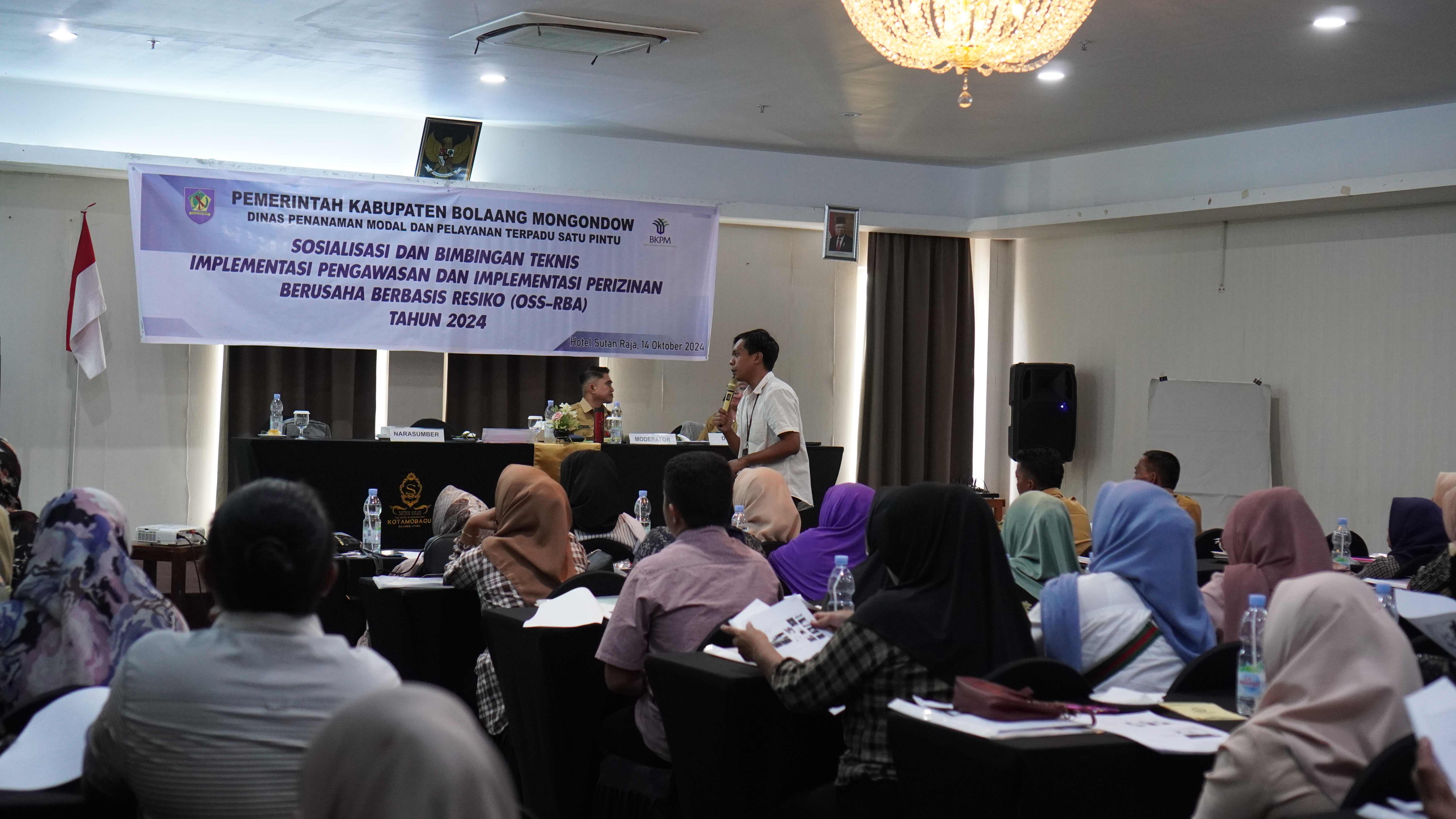 Asisten Penyuluh Kantor Pelayanan Pajak (KPP) Pratama Kotamobagu menjadi narasumber Sosialisasi dan Bimbingan Teknis Implementasi Pengawasan dan Perizinan Berusaha Berbasis Risiko (OSS-RBA) Tahun 2024. Sosialisasi ini berlangsung di Aula Kinalang Hotel Sutan Raja Kotamobagu, Sulawesi Utara (Senin, 14/10). Kegiatan tersebut diselenggarakan oleh Dinas Penanaman Modal dan Pelayanan Terpadu Satu Pintu (DPM-PTSP) Kabupaten Bolaang Mongondow (Bolmong). Sebanyak 79 orang yang terdiri dari pelaku Usaha Mikro Kecil Menegah (UMKM) dan perangkat desa se-Bolmong mengikuti kegiatan sosialisasi tersebut.