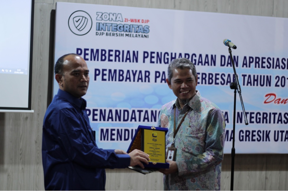 KPP Pratama Gresik Utara mengundang 20 kontributor pembayar pajak terbesar tahun 2018 yang diwakili oleh Direktur masing-masing perusahaan di Aula KPP Pratama Gresik (Kamis, 23/5). Acara ini bertujuan untuk memberikan penghargaan serta menjalin kerjasama antara KPP Pratama Gresik Utara dengan wajib pajak yang memberikan kontribusi penerimaan pajak terbesar di KPP Pratama Gresik Utara selama tahun 2018, selain itu untuk mendukung terciptanya Zona Integritas Wilayah Bebas Korupsi (ZI WBK) dengan penandatangan pakta integritas oleh Direktur masing-masing perusahaan.