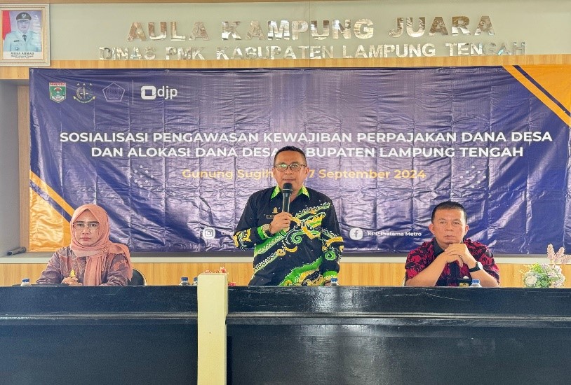 Kantor Pelayanan Pajak (KPP) Pratama Metro berkolaborasi dengan Dinas Pemberdayaan Masyarakat dan Kampung (PMK) Kabupaten Lampung Tengah, Inspektorat Kabupaten Lampung Tengah, dan Kejaksaan Negeri Kabupaten Lampung Tengah mengadakan Sosialisasi Kewajiban Perpajakan Dana Desa dan Alokasi Dana Desa Kabupaten Lampung Tengah (Kamis, 26/9). Kegiatan sosialisasi yang dilaksanakan di Aula Dinas PMK Kabupaten Lampung Tengah ini diikuti oleh 283 perwakilan perangkat desa di Kabupaten Lampung Tengah.