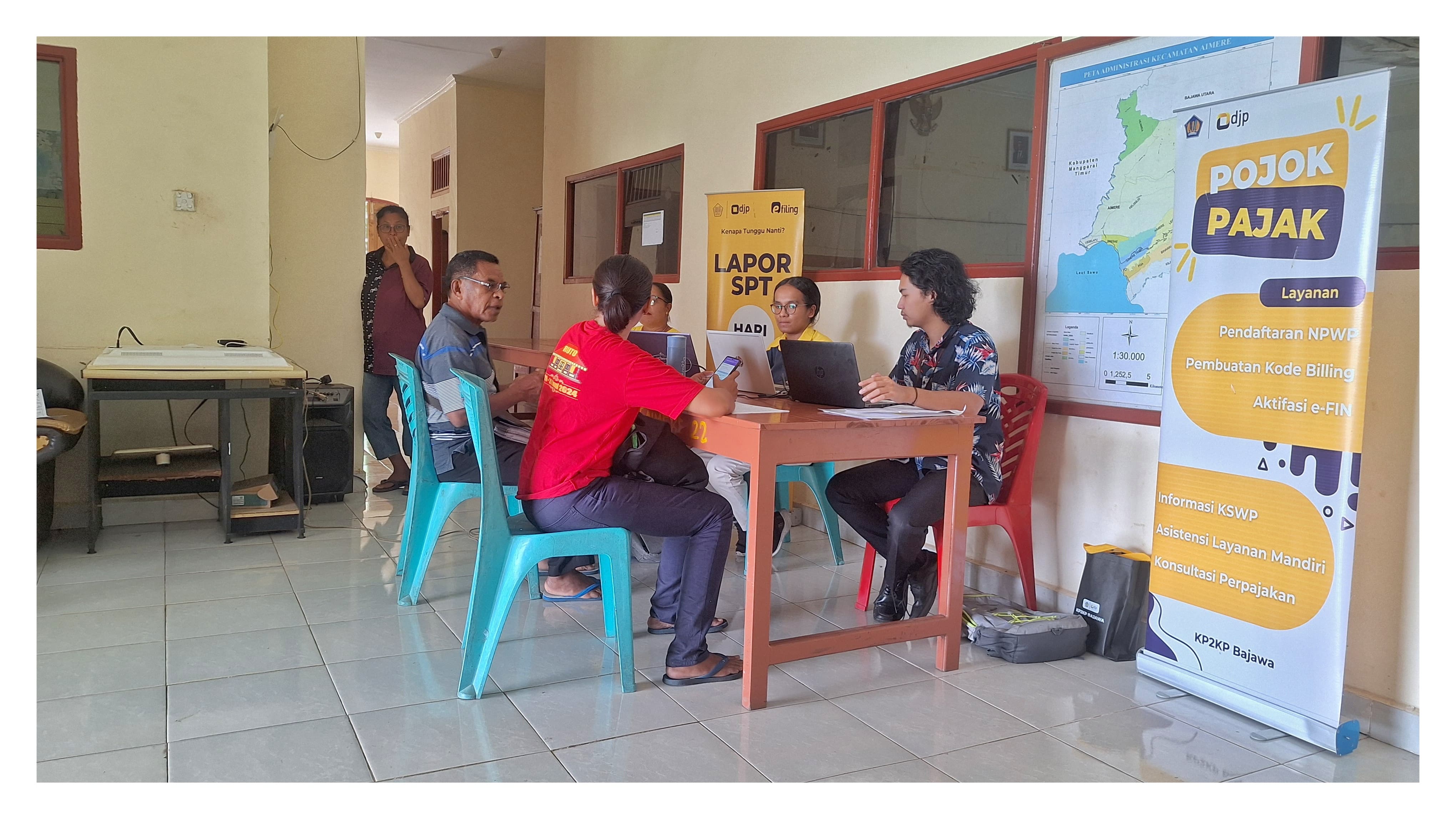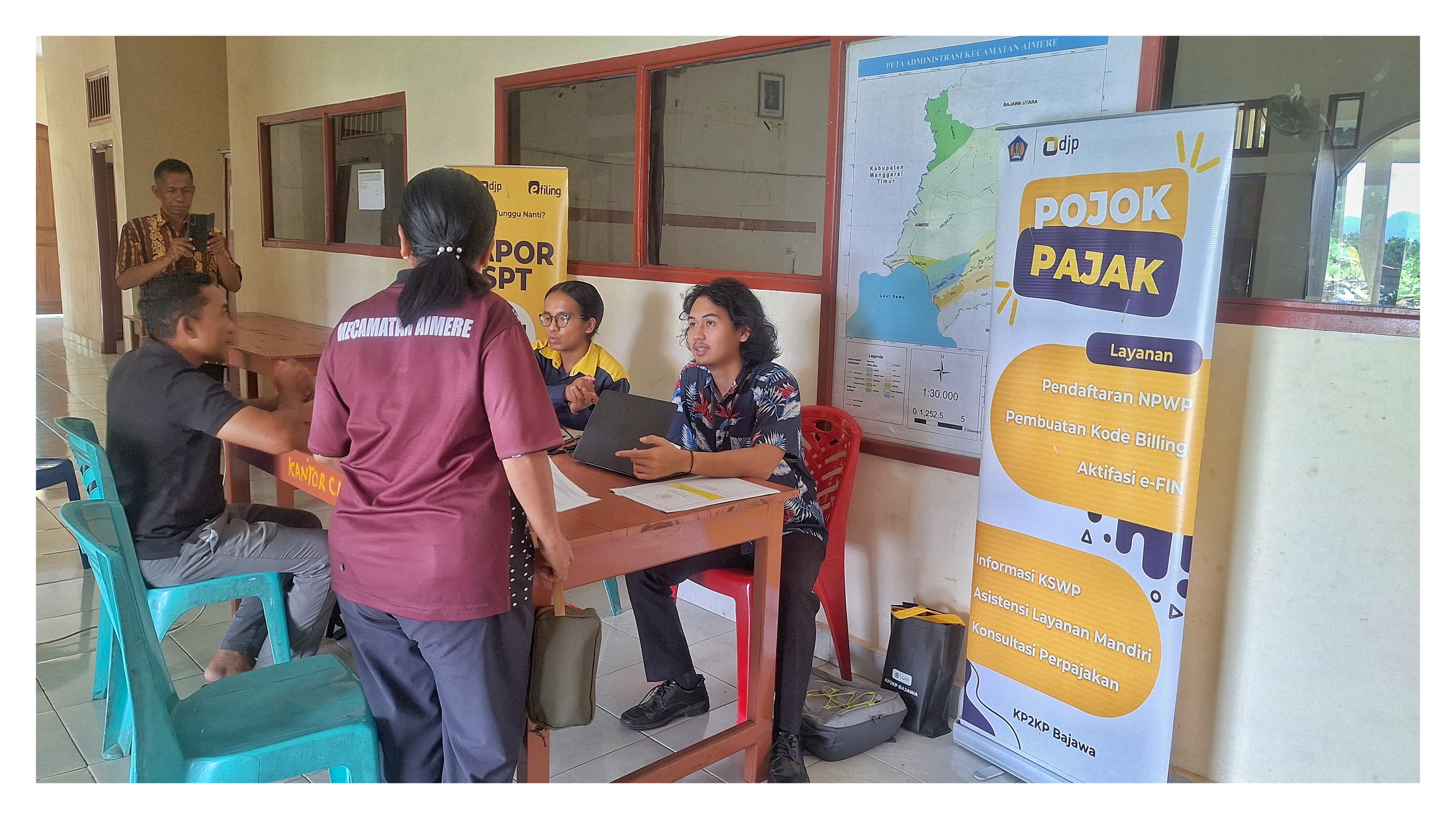 Kantor Pelayanan, Penyuluhan, dan Konsultasi Perpajakan (KP2KP) Bajawa membuka pojok pajak di Aula Kantor Camat Aimere, Kabupaten Ngada yang dimulai pukul 10.00 s.d. 14.00 WITA, (Kamis, 27/3).