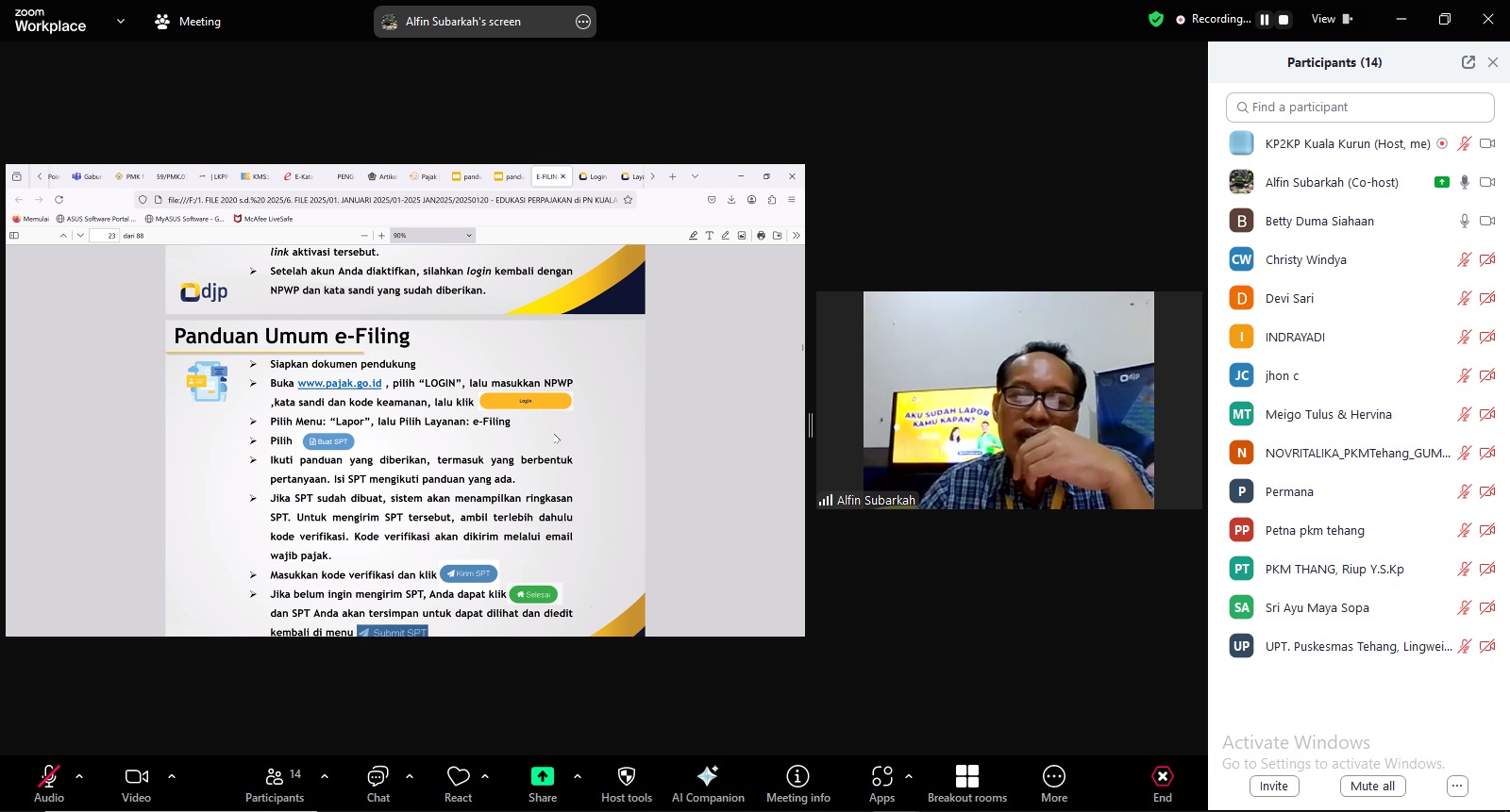 Di akhir kegiatan, dilakukan sesi tanya jawab. Peserta antusias mengajukan pertanyaan terhadap materi yang disampaikan dan merasa sangat terbantu dengan asistensi pelaporan SPT Tahunan melalui Zoom Meeting ini.