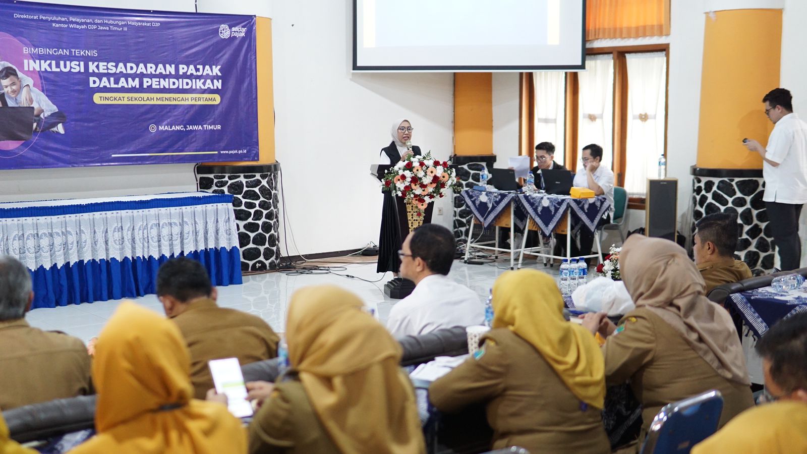Direktorat Penyuluhan, Pelayanan, dan Hubungan Masyarakat dan Kantor Wilayah DJP Jawa Timur III bekerja sama dengan Dinas Pendidikan dan Kebudayaan Kota Malang mengadakan bimbingan teknis dan penandatanganan perjanjian kerja sama bersama 30 Kepala Sekolah Menengah Pertama (SMP) di Kota Malang, bertempat di Aula SMP Negeri 1 Kota Malang (Senin, 30/10).