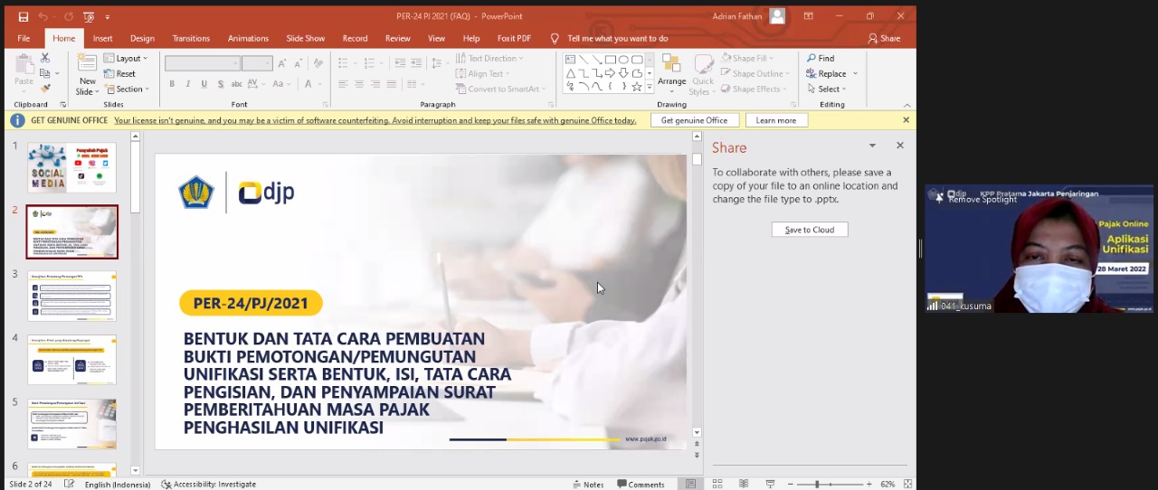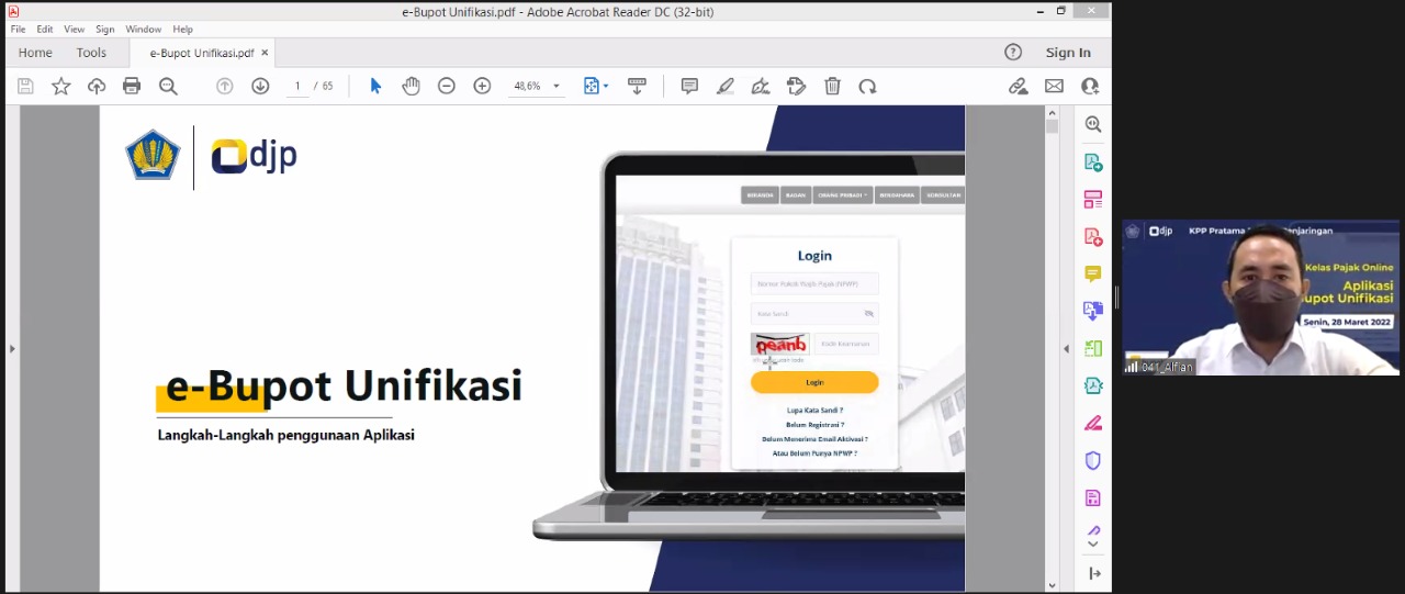 Kantor Pelayanan Pajak (KPP) Pratama Jakarta Penjaringan lakukan sosialisasi Tata Cara Pengisian e-Bupot Unifikasi di Jakarta melalui Zoom (Senin, 28/3). Acara dibuka Oppie Fungsional Penyuluh Pajak KPP Pratama Jakarta Penjaringan. Materi dipaparkan Alfian dan Kusumadewi Fungsional Penyuluh Pajak KPP Pratama Jakarta Penjaringan. Sosialisasi dihadiri 10 wajib pajak.