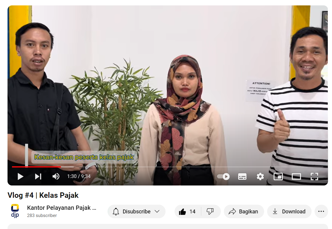 Vlog ini berdurasi selama sembilan menit yang menayangkan cuplikan-cuplikan suasana Kelas Pajak yang telah berlangsung selama tiga hari sejak tanggal 23 s.d. 25 Juli 2024. Selain itu terdapat pula, cuplikan penyampaian kesan-kesan oleh peserta Kelas Pajak. Kelas Pajak ini dihadiri oleh puluhan Wajib Pajak Badan yang terdaftar sebagai Pengusaha Kena Pajak sehingga memiliki kewajiban untuk menerbitkan faktur pajak.