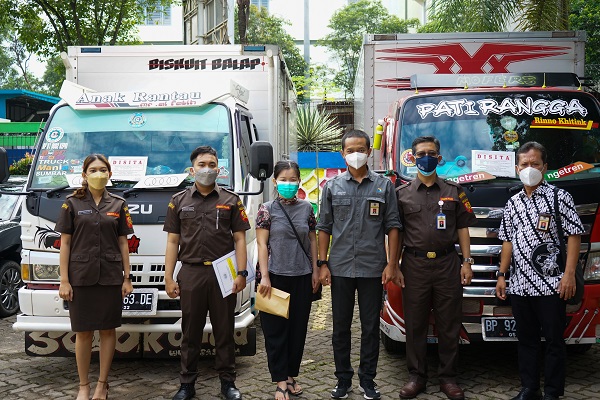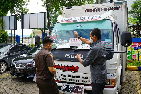 Juru Sita Pajak Negara (JSPN) Kantor Pelayanan Pajak (KPP) Madya Batam melakukan penyitaan terhadap aset wajib pajak yang memiliki tunggakan pajak, yaitu berupa 2 truk di lapangan parkir KPP Madya Batam, Kepulauan Riau (Kamis, 9/9).