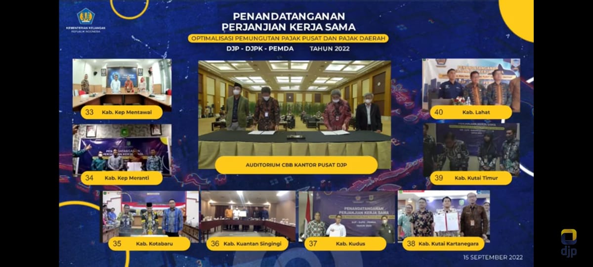 Kantor Pelayanan Pajak (KPP) Pratama Kudus serta Kantor Wilayah Direktorat Jenderal Pajak (Kanwil DJP) Jawa Tengah I mendampingi Pemerintah Kabupaten Kudus dalam kegiatan seremoni penandatanganan dokumen Perjanjian Kerja Sama (PKS) Tripartit Tahap IV terkait optimalisasi pemungutan pajak pusat dan daerah di Kudus melalui Aplikasi Zoom Meeting (Kamis, 15/09).