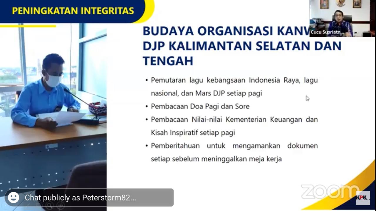 Kepala Kantor Wilayah Direktorat Jenderal Pajak Kalimantan Selatan dan Tengah Cucu Supriata menjadi narasumber dalam acara Sarasehan Pustaka dengan tema "Pelayanan Publik dan Pemberantasan Korupsi" di aplikasi Zoom Meeting dan saluran Youtube KPK RI, di Banjarmasin (Jumat, 25/9). Dalam acara tersebut hadir pula sebagai narasumber yaitu Kepala Biro Humas KPK Febri Diansyah, Wakil Rektor Universitas Lambung Mangkurat Dr. Aminuddin Prahatama, dan masih banyak lagi.
