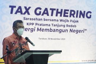 Kepala Kantor Wilayah Direktorat Jenderal Pajak Kalimantan Timur dan Utara Max Darmawan menghadiri acara Tax Gathering yang diselenggarakan oleh Kantor Pelayanan Pajak (KPP) Pratama Tanjung Redeb di Aula Kantor Pelayanan Kekayaan Negara dan Lelang, Kota Tarakan (Kamis, 18/11). Kegiatan ini dihadiri oleh 23 wajib pajak KPP Pratama Tanjung Redeb dengan kontribusi pembayaran pajak terbesar.