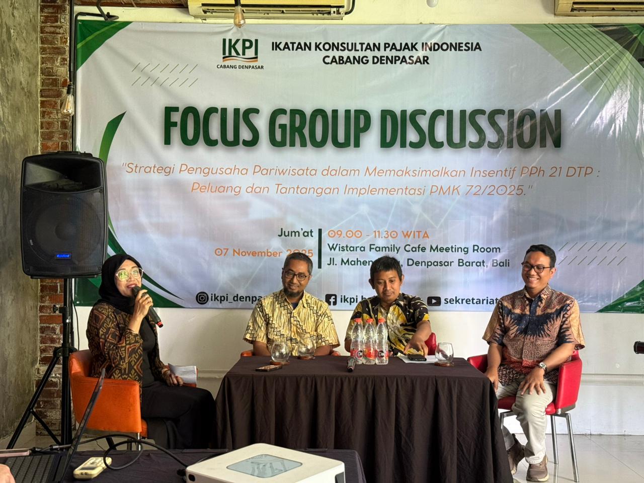 Kantor Wilayah Direktorat Jenderal Pajak (Kanwil DJP) Bali memenuhi undangan menjadi narasumber dari Ikatan Konsultan Pajak Indonesia (IKPI) Cabang Denpasar pada acara Forum Group Discussion (FGD) dengan tema,"Strategi Pengusaha Pariwisata dalam Memaksimalkan Insentif PPh 21 DTP: Peluang dan Tantangan Implementasi PMK 72/2025,” di Jl Mahendrata, Kota Denpasar, Bali (Jumat, 7/11).