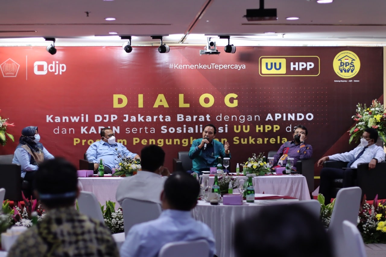 Kantor Wilayah DJP Jakarta Barat menggelar acara Dialog dengan Asosiasi Pengusaha Indonesia (APINDO) dan Kamar Dagang dan Industri (KADIN) serta Sosialisasi UU Harmonisasi Peraturan Perpajakan (UU HPP) dan Program Pengungkapan Sukarela (PPS) secara hybrid, luring dan daring, di Aula Harmoni Jalan Tomang Raya Jakarta Barat (Rabu, 15/12).