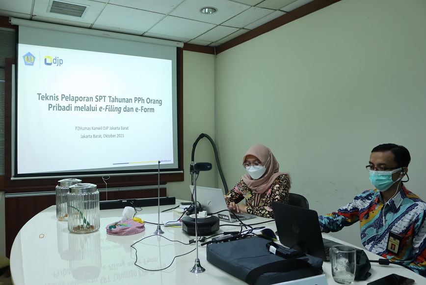 Kantor Wilayah Direktorat Jenderal Pajak Jakarta Barat melaksanakan sosialisasi bimbingan teknis dengan tema “Pelaporan SPT Tahunan melalui e-filing dan e-Form”. Kegiatan tersebut dihadiri oleh para karyawan dari 24 pemberi kerja di wilayah Jakarta Barat yang dilaksanakan secara daring melalui aplikasi Zoom Meeting pada Kantor Wilayah Direktorat Jenderal Pajak Jakarta Barat, Jakarta (Selasa, 26/10).