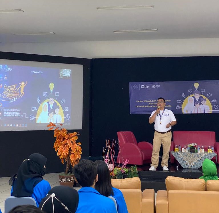 Turut memeriahkan Pajak Bertutur, Kantor Wilayah DJP Jakarta Timur menyelenggarakan Pajak Bertutur di Universitas Bina Sarana Informatika (UBSI) Kalimalang, Jakarta Timur (Kamis, 18/08). Bertempat di Aula UBSI, kegiatan dilaksanakan secara luring dengan memperhatikan protokol kesehatan Covid-19.