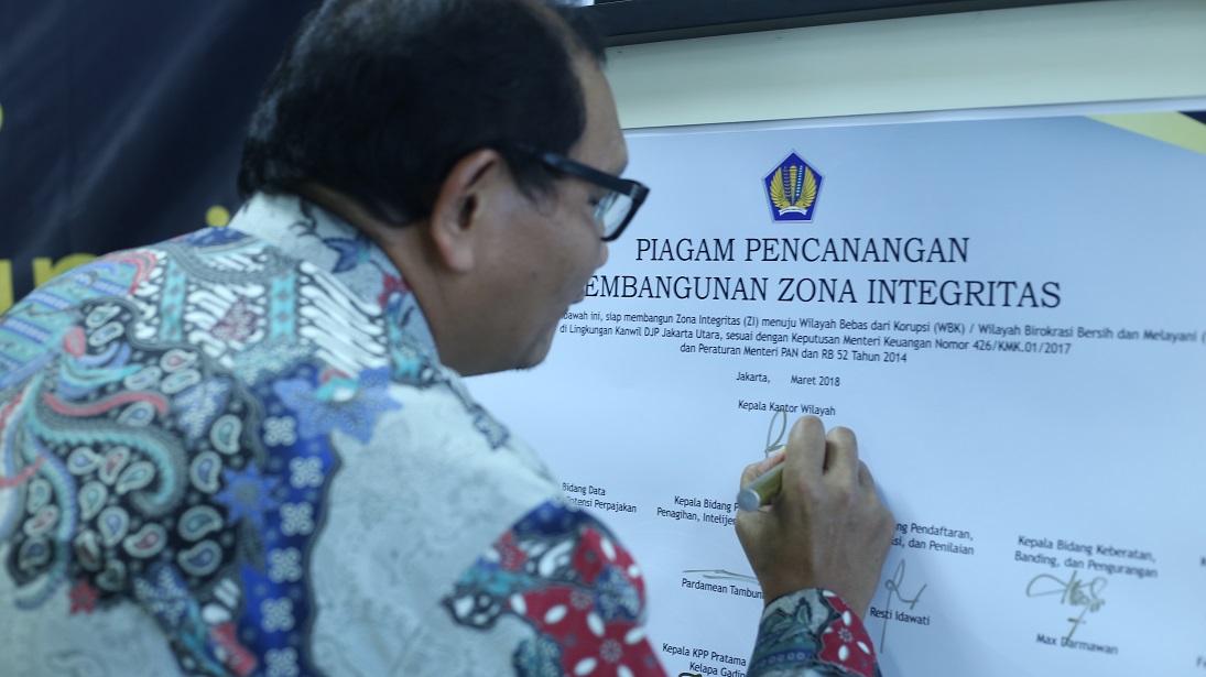 Kantor Wilayah DJP Jakarta Utara menyelenggarakan acara penandatanganan dan pencanangan komitmen mewujudkan Zona Integritas menuju Wilayah Bebas dari Korupsi (ZI WBK) di Ruang Rapat Besar Kantor Wilayah DJP Jakarta Utara, Gd. Mari’e Muhammad Lt. 26 Kantor Pusat Drektorat Jenderal Pajak, Jl. Gatot Subroto Kav. 40-42 Jakarta Selatan (Jumat, 09/03).
