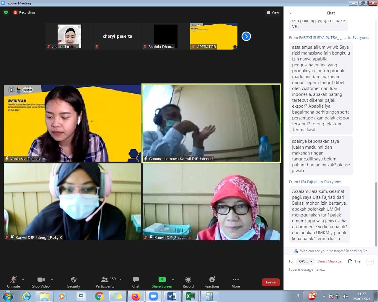 Bergabung sebagai narasumber, Rizky Keroshinta dan Sri Juaeni memulai pemaparan dengan menjelaskan latar belakang diterbitkannya kebijakan pemerintah untuk mengatur tersendiri tata cara penetapan aspek perpajakan pada sektor perdagangan yang dilakukan melalui Perdagangan Melalui Sistem Elektronik (PMSE) dan dijelaskan pula terkait Peraturan Menteri Keuangan (PMK) Nomor 48 tahun 2020 tentang Tata Cara Penunjukan Pemungut, Pemungutan, dan Penyetoran, Serta Pelaporan Pajak Pertambahan Nilai Atas Pemanfaatan Barang Kena Pajak Tidak Berwujud da/atau Jasa Kena Pajak Dari Luar Daerah Pabean di Dalam Daerah Pabean Melalui Perdagangan Melalui Sistem Elektronik.