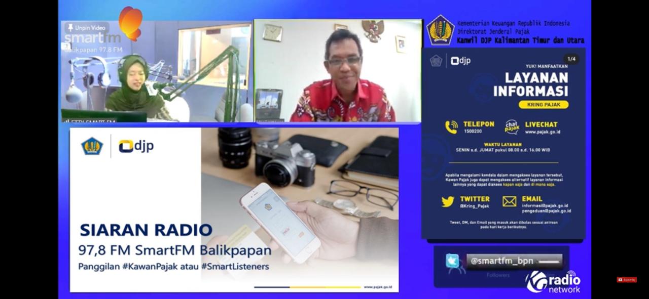 Kepala Kantor Wilayah Direktorat Jenderal Pajak Kalimantan Timur dan Utara (Kanwil DJP Kaltimtara) Max Darmawan menjadi narasumber gelar wicara bersama Radio 98.7 SmartFM Balikpapan (Jumat, 26/3). Disiarkan secara daring dari ruang kerjanya, Max Darmawan membawakan materi pelaporan Surat Pemberitahuan (SPT) Tahunan Orang Pribadi.