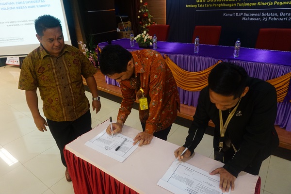 Dalam rangka pencanangan pembangunan zona integritas menuju wilayah bebas korupsi, Kanwil DJP Sulselbartra (Sulawesi Selatan, Barat, dan Tenggara) melakukan penandatangan pakta integritas di Aula Kanwil DJP Sulselbartra, Makassar, Sulawesi Selatan (Jumat, 23/2). Perwakilan pejabat eselon IV, fungsional, dan pelaksana menandatangani pakta integritas secara simbolis yang disaksikan pejabat eselon III bidang masing-masing di hadapan seluruh pegawai. Selanjutnya, seluruh pegawai juga akan ikut menandatangani pakta integritas tersebut.
