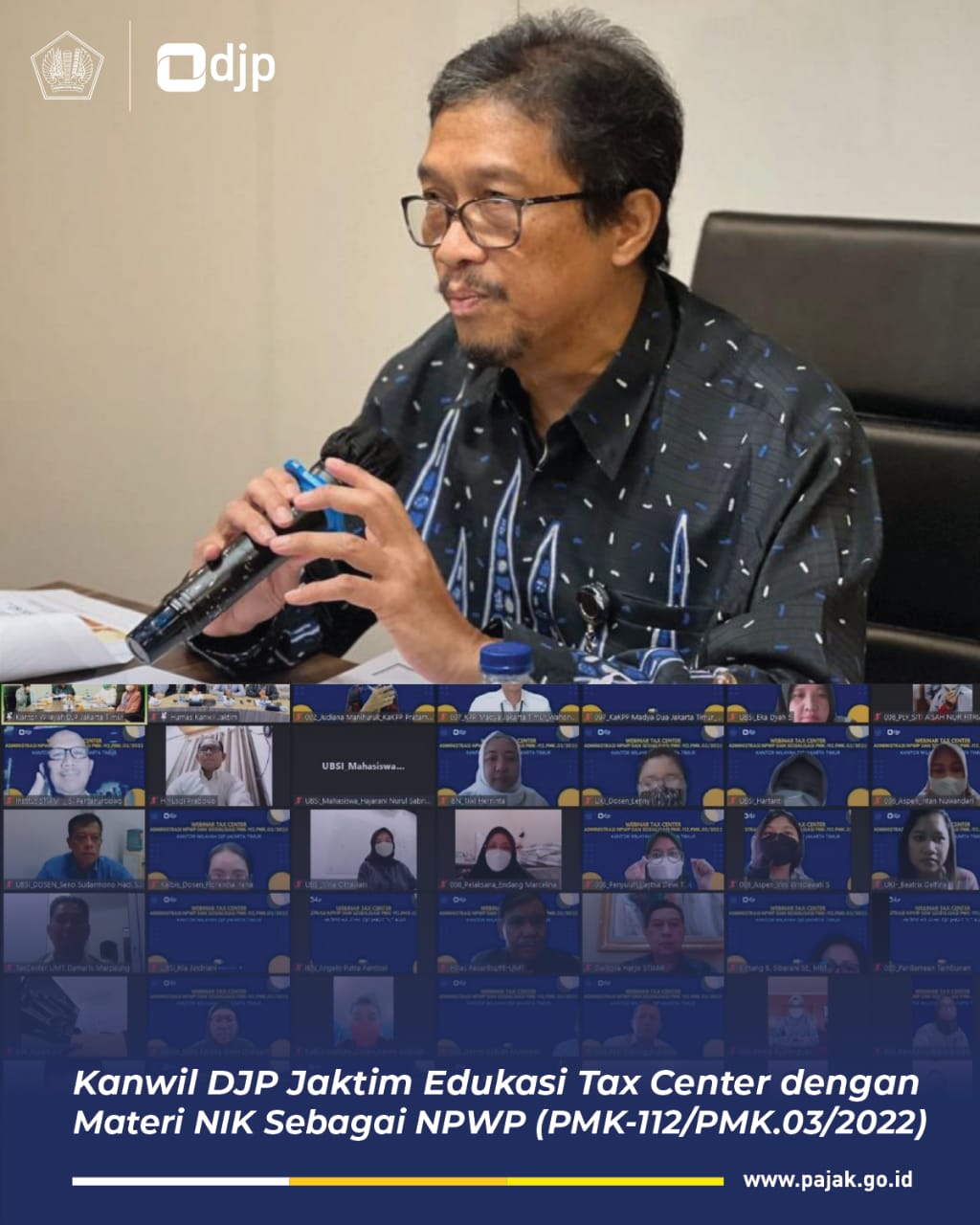 Kanwil DJP Jakarta Timur menggelar webinar dengan mengundang seluruh Tax Center di Lingkungan Kanwil DJP Jakarta Timur, dengan mengusung materi webinar “NIK sebagai NPWP”, berdasarkan PMK-112/PMK.03/2022 (Kamis, 25/8). Sejumlah 14 (empat belas) Tax Center Perguruan Tinggi mengikuti Webinar yang dilakukan secara daring melalui aplikasi zoom meeting.