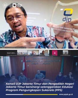 Kantor Wilayah Direktorat Jenderal Pajak (Kanwil DJP) Jakarta Timur bekerja sama dengan Pengadilan Negeri Jakarta Timur menggelar acara Sosialisasi Program Pengungkapan Sukarela (PPS) untuk seluruh pegawai Pengadilan Negeri Jakarta Timur secara daring melalui aplikasi Zoom Meeting, bertempat di Ruang Conference Kanwil DJP Jakarta Timur (Rabu, 25/5).