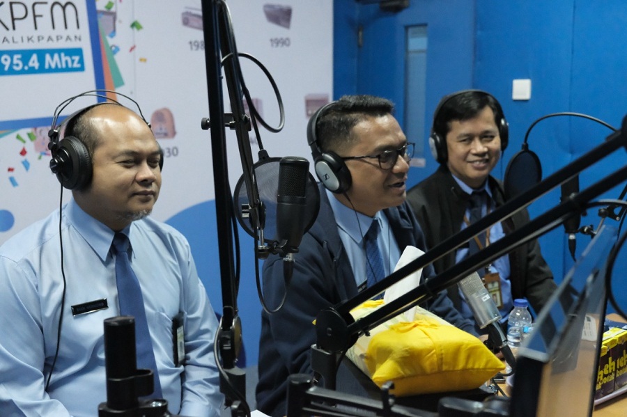 Kepala Bidang P2Humas Kanwil DJP Kalimantan Timur dan Utara Emri Mora Singarimbun bersama Kepala KPP Pratama Balikpapan Timur Budi Hernowo dan KPP Pratama Balikpapan Barat Efendi Pinem menyapa para pendengar radio melalui siaran radio Smart FM Balikpapan (Rabu, 4/3). Kegiatan ini dilaksanakan untuk menyambut masa pelaporan SPT Tahunan 2019 dan Spectaxcular 2020.