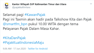 Kantor Wilayah Direktorat Jenderal Pajak Kalimantan Timur dan Utara (Kanwil DJP Kaltimtara) menjadi narasumber pada Gelar Wicara (Talk Show) “Kita dan Pajak” di 97,8 Smart FM Balikpapan (Rabu, 17/6). Gelar wicara ini dimulai pada pukul 10.00 WITA sampai dengan 11.00 WITA melalui siaran radio langsung dan Live Instagram @smartfm_bpn yang dipandu oleh penyiar Etty dan narasumber Pemilu Purnomo dan Adi Chandra dari Bidang Keberatan, Banding, dan Pengurangan Kanwil DJP Kaltimtara.