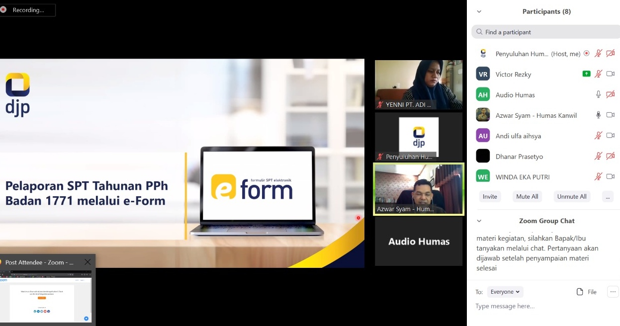 Azwar Syam selaku Kepala Seksi Bimbingan Penyuluhan dan Pengelolaan Dokumen Kanwil DJP Sulselbartra yang sekaligus bertindak sebagai pemateri mengungkapkan bahwa kelas pajak online ini menjadi solusi atas gerakan pembatasan sosial yang menyebabkan sosialisasi perpajakan secara langsung tidak dapat dilaksanakan.