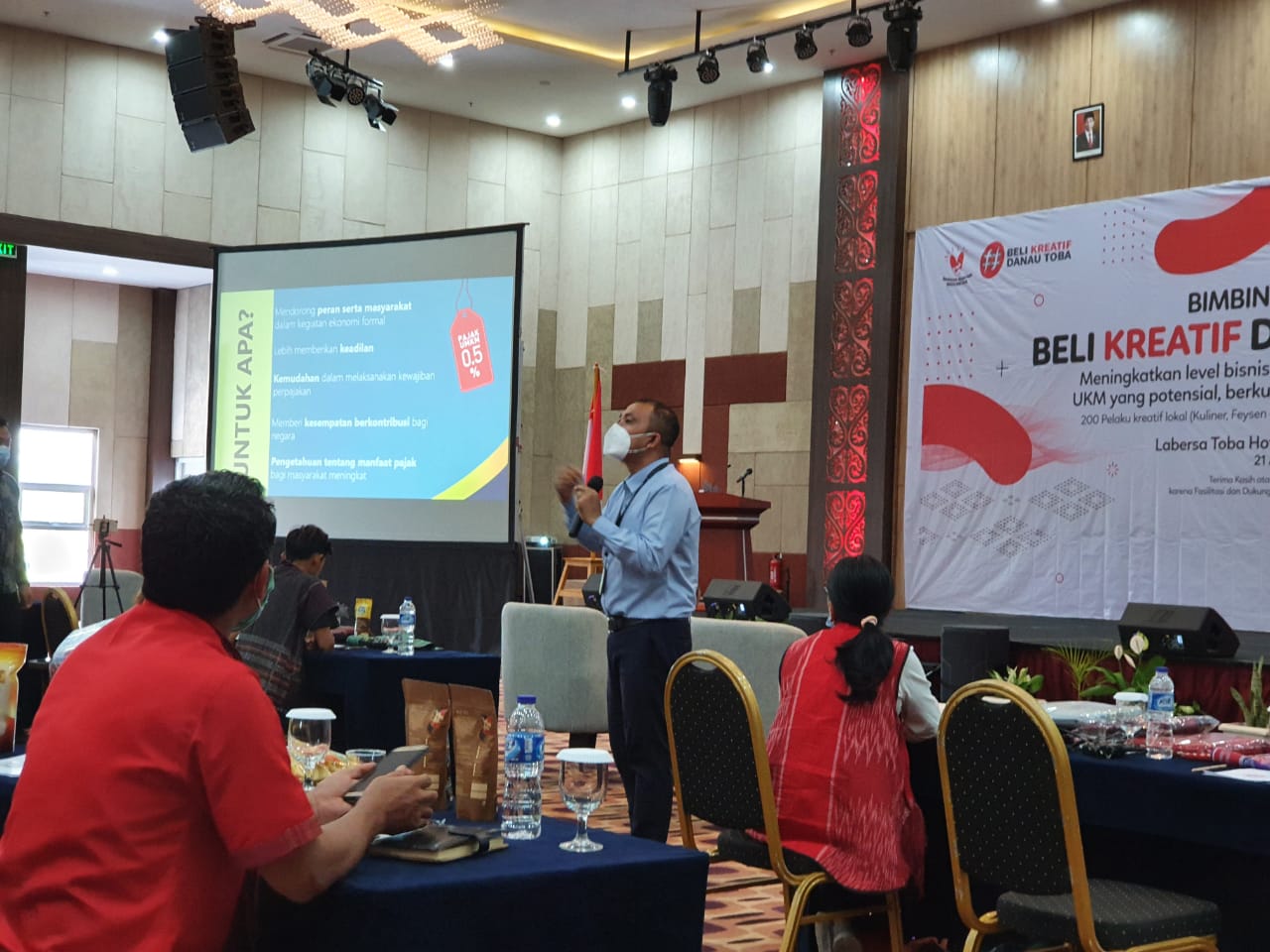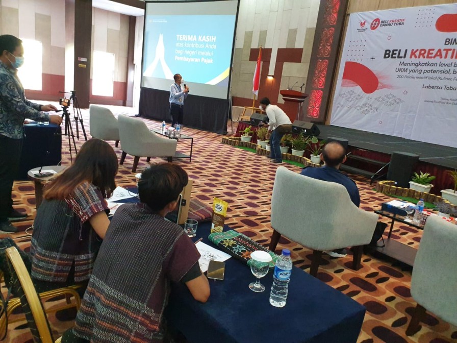 Kanwil DJP Sumatera Utara II bekerja sama dengan Kementerian Pariwisata dan Ekonomi Kreatif Republik Indonesia (Kemenparekraf RI) kembali mengadakan bimbingan teknis (bimtek) kepada para pelaku Usaha Kecil, Mikro, dan Menengah (UMKM) yang tergabung dalam Program Beli Kreatif Danau Toba (BKDT) di Labersa Hotel & Convention Centre, Balige (Senin, 19/3).