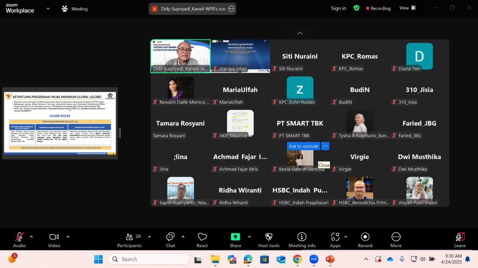 Kantor Wilayah Direktorat Jenderal Pajak (Kanwil DJP) Wajib Pajak Besar (WPB) kembali menyelenggarakan kegiatan Kelas Pajak secara daring, Jakarta (Kamis, 24/4). Kegiatan ini mengangkat tema “Pengenaan Pajak Minimum Global Berdasarkan Kesepakatan Internasional” dan diikuti oleh sekitar 25 peserta yang merupakan perwakilan wajib pajak besar.