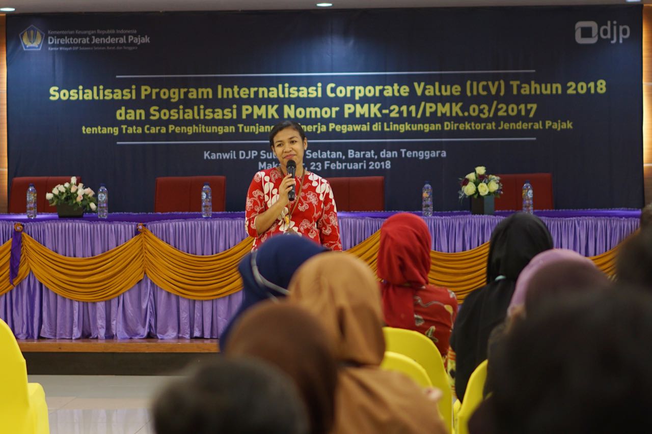 Dalam rangka mewujudkan nilai-nilai Kementerian Keuangan, seluruh pegawai Kanwil DJP Sulselbartra (Sulawesi Selatan, Barat, dan Tenggara) mengikuti sosialisasi program ICV 2018 yang diselenggarakan di Aula Kanwil DJP Sulselbartra, Makassar, Sulawesi Selatan (Jumat, 23/2)