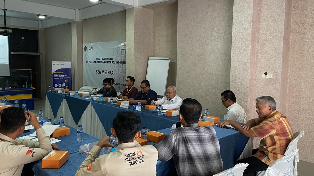 Kantor Pelayanan, Penyuluhan, dan Konsultasi Perpajakan (KP2KP) Banjar bekerja sama dengan Kantor Pos Indonesia Cabang Banjar dan Ciamis menggelar kegiatan Rapat Koordinasi Pengamanan Penerimaan Bea Materai bertempat di Aula KP2KP Banjar, Jalan Kaum no. 1, Kota Banjar (Kamis, 3/8).