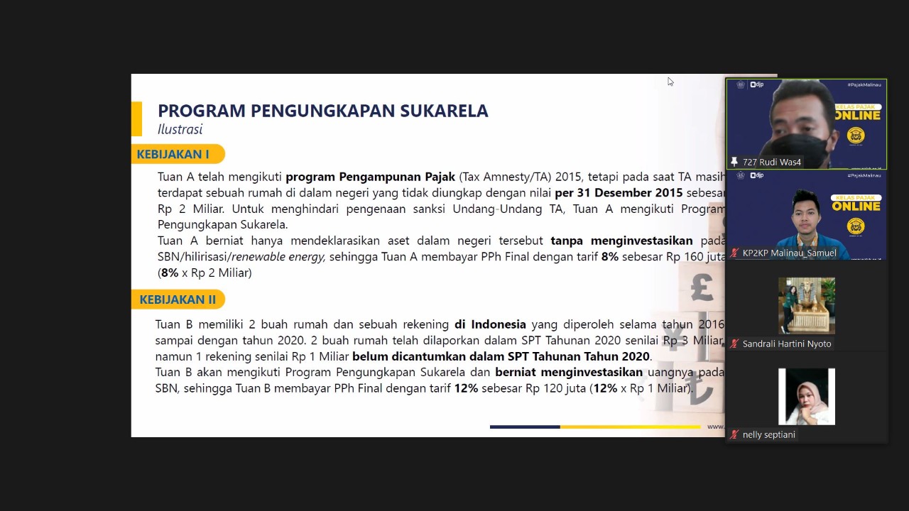 Kantor Pelayanan Penyuluhan dan Konsultasi Perpajakan (KP2KP) Malinau menggelar kelas pajak secara daring dengan tema Program Pengungkapan Sukarela (PPS) melalui aplikasi Zoom Meeting di Kab. Malinau (Jumat, 21/01).