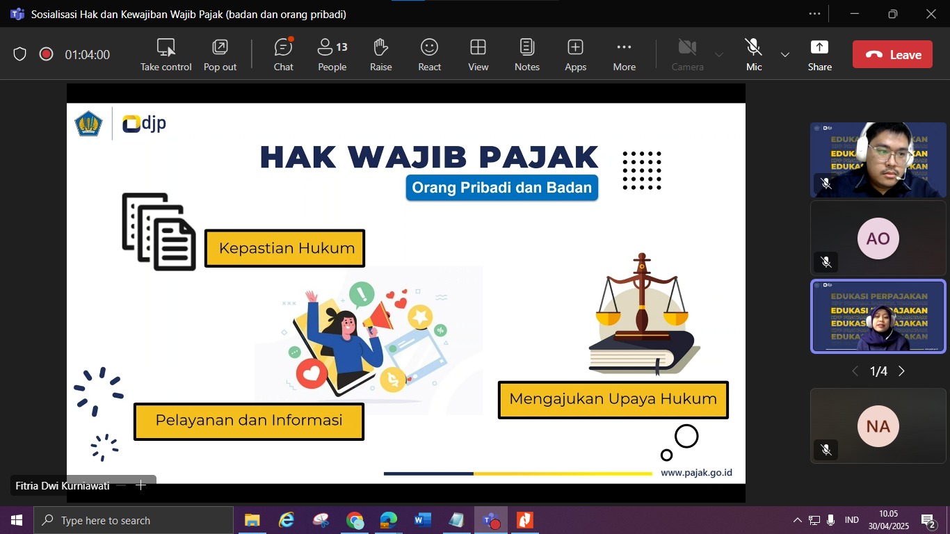 Kegiatan ini ditujukan bagi wajib pajak baru yang terdaftar di KPP Pratama Jakarta Tamansari dan dilaksanakan secara daring melalui Microsoft Teams di Jakarta (Rabu, 30/4).