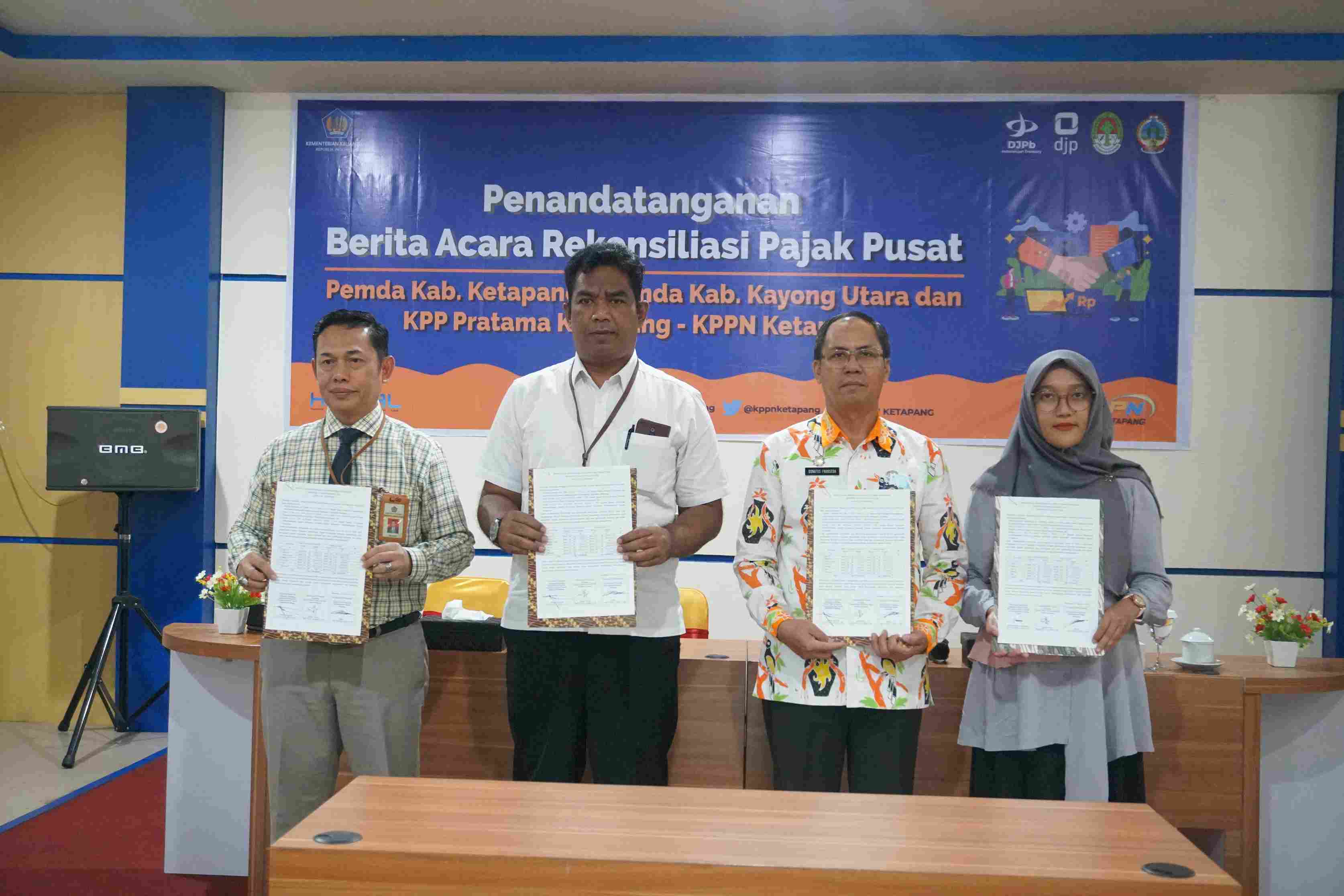 Acara dilanjutkan dengan penandatanganan BA Rekonsiliasi atas Penyetoran Pajak Pusat Semester I Tahun 2022 yang dilakukan oleh Bapak Donatus Franseda, AP., M.M selaku Kepala Badan Pengelola Keuangan dan Aset Daerah Kabupaten Ketapang, Bapak Ismail, SST.Ak, M.Comm selaku Kepala Kantor Pelayanan Perbendaharaan Negara Tipe A2 Ketapang, Bapak Edral Yulvan S.H., M.M selaku Kepala Kantor Pelayanan Pajak Pratama Ketapang, dan Ibu Hendriana Niken Ambarwati selaku Plh. Kepala Badan Keuangan Daerah Kabupaten Kayong Utara.