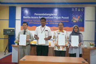 Kepala KPP Pratama Ketapang bersama Kepala KPPN Tipe A2 Ketapang, Kepala Badan Pengelola Keuangan dan Aset Daerah (BPKAD), dan Plh. Kepala Badan Keuangan Daerah (BKD) Kabupaten Kayong Utara melakukan Penandatanganan Berita Acara (BA) Rekonsiliasi atas Penyetoran Pajak Pusat Semester I Tahun 2022 di Ruang Aula Kantor Pelayanan Perbendaharaan Negara Tipe A2 Ketapang (Kamis, 25/8).