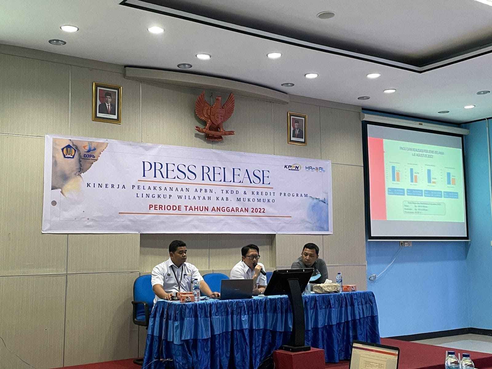 Materi yang dipaparkan dalam Press Release ini meliputi, Realisasi Penyerapan Anggaran di Kabupaten Mukomuko, Kebijakan Pengelolaan Dana Desa, Realisasi Penerimaan Pajak Nasional dan KPP Pratama Bengkulu Satu per 27 September 2022, dan Kebijakan Perpajakan 2022.
