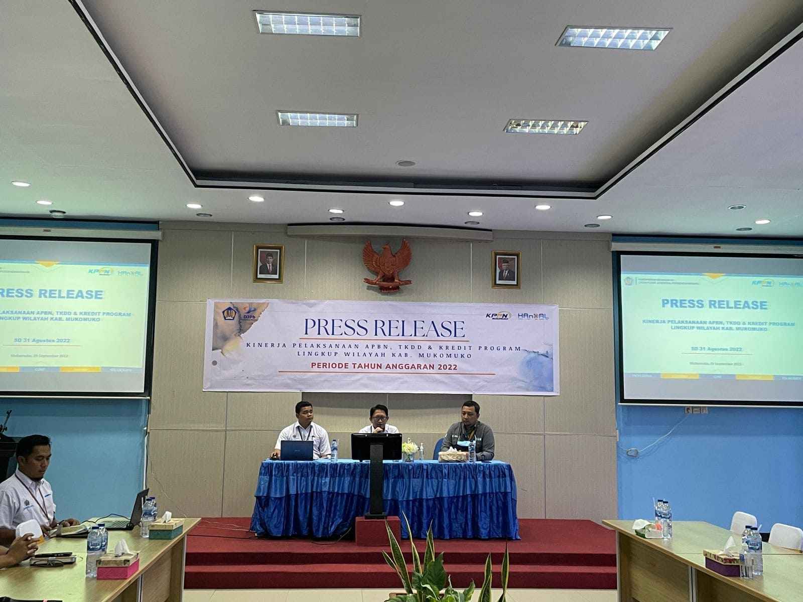 Kementerian Keuangan (Kemenkeu) di wilayah Kabupaten Mukomuko mengundang seluruh awak media Kabupaten Mukomuko dalam rangka menghadiri Press Release APBN Kabupaten Mukomuko Triwulan III Tahun 2022 di Aula Kantor Pelayanan Perbendaharaan Negara(KPPN), Kabupaten Mukomuko (Kamis, 29/9).