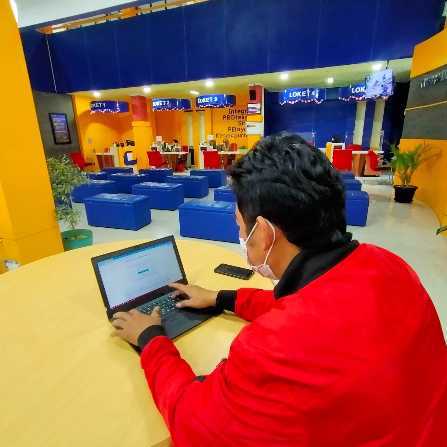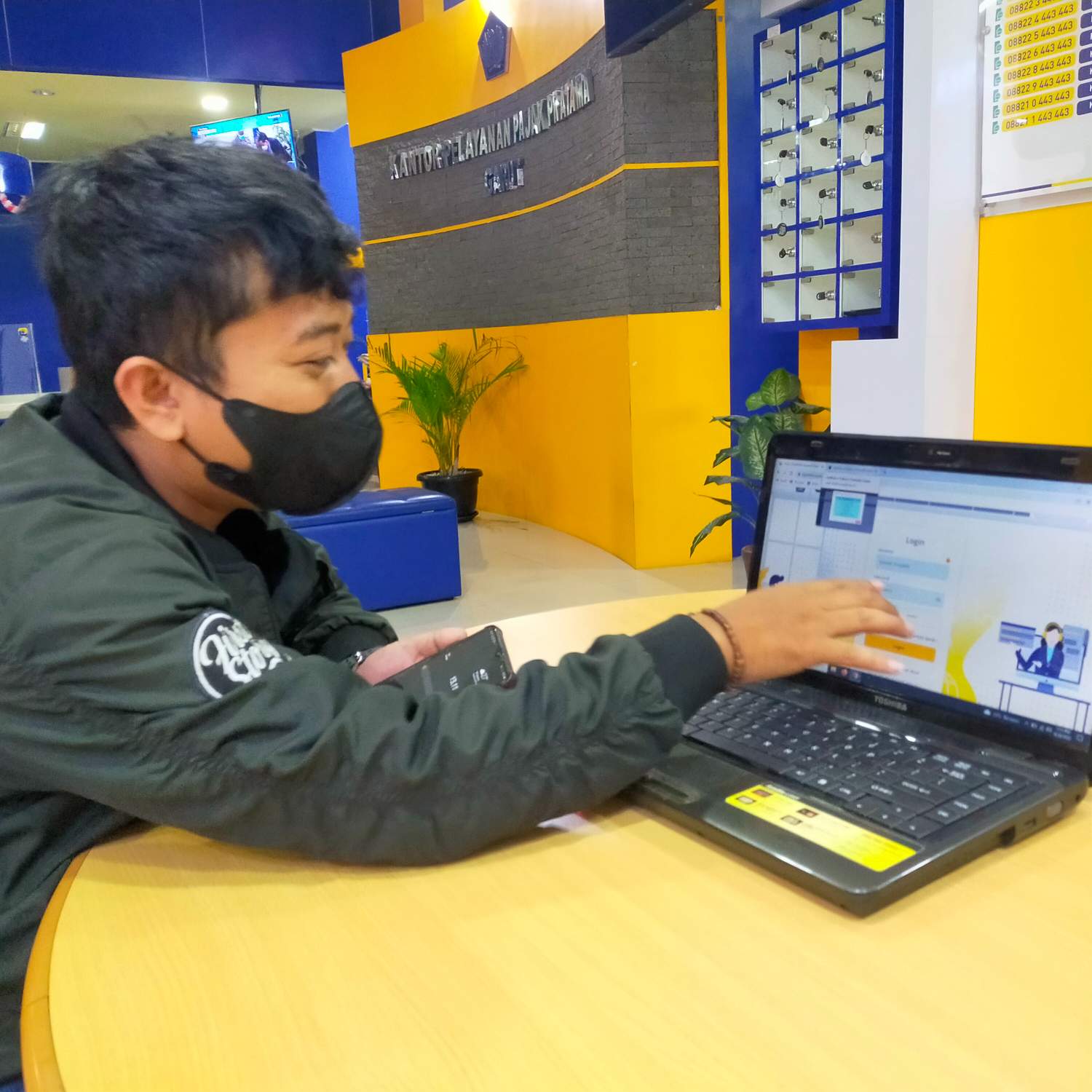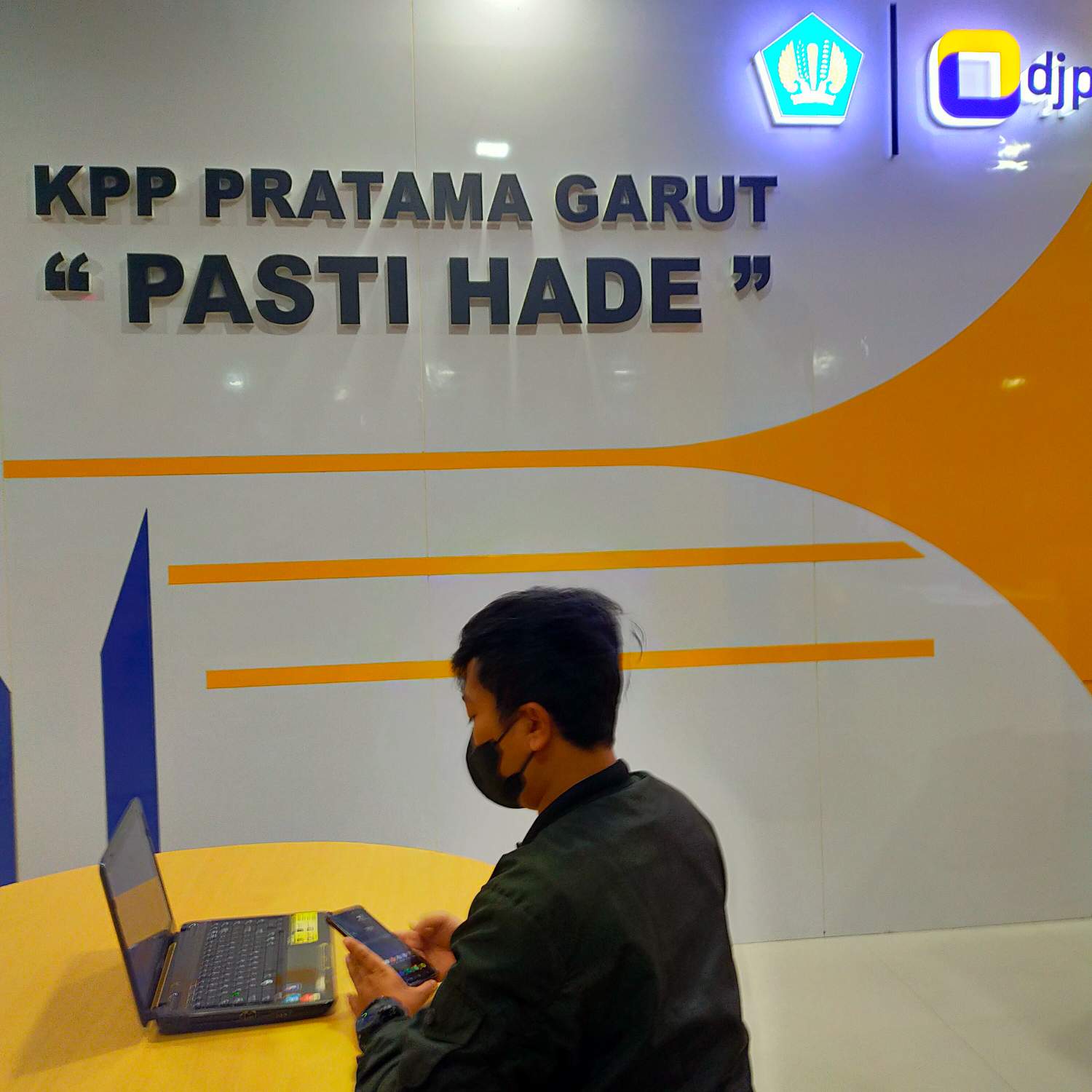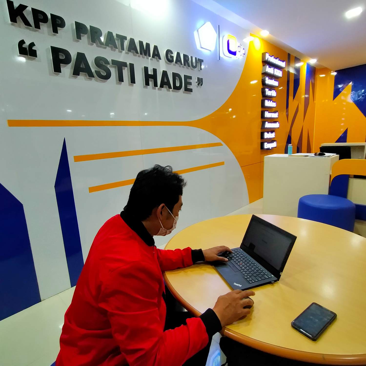Penyuluh Pajak Kantor Pelayanan Pajak (KPP) Pratama Garut Dede Setia saat piket Helpdesk memberikan asistensi secara langsung kepada wajib pajak yang berstatus Pengusaha Kena Pajak (PKP) tentang aplikasi e-faktur di ruang konsultasi, Jalan Pembangunan No 224 Garut, (Selasa, 20/9).