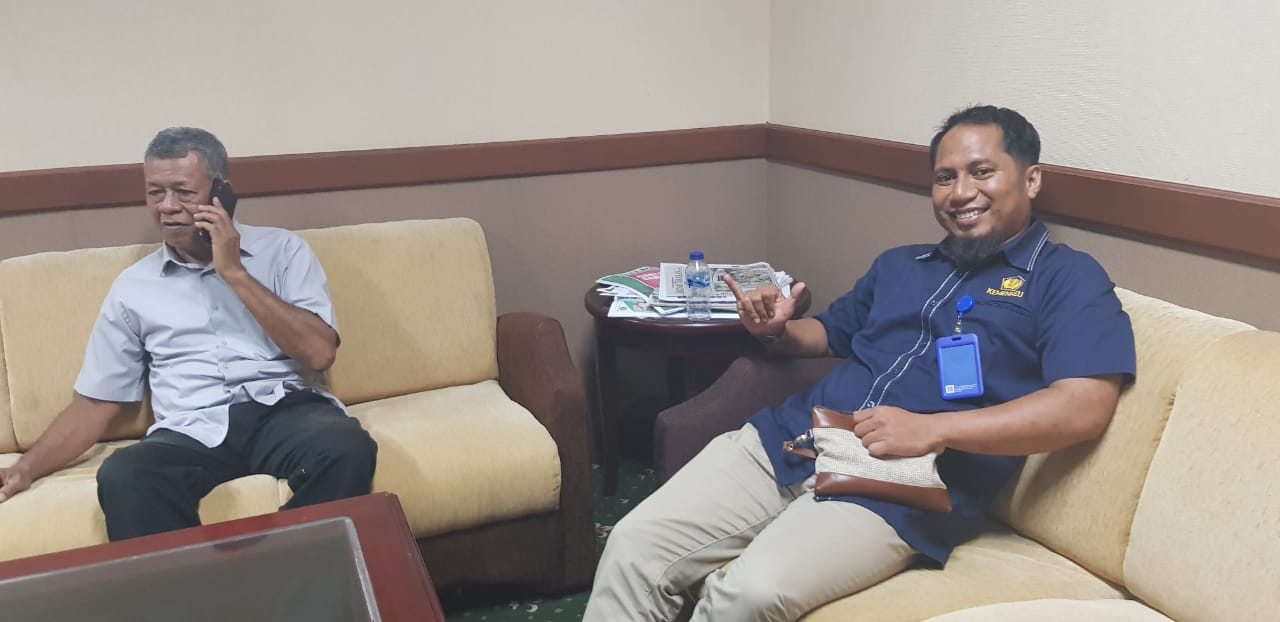 Bersama Kadri Silawane, pegawai KP2KP Nunukan, Irfan berdiskusi seputar penguatan kolaborasi pajak pusat dan daerah, kepatuhan pelaporan Surat Pemberitahuan (SPT) warga Nunukan.