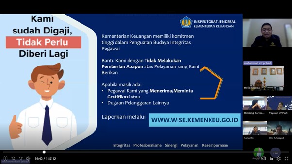 Selanjutnya, ia menyampaikan materi terkait integritas, antikorupsi dan upaya KPP dalam pembangunan ZI WBK. Hendrayana menyampaikan paparan dengan judul “Peran Masyarakat dalam Upaya Peningkatan Budaya Integritas di Lingkungan Kementrian Keuangan” dengan topik terkait pengendalian gratifikasi dan penanganan dan perlindungan pelapor.
