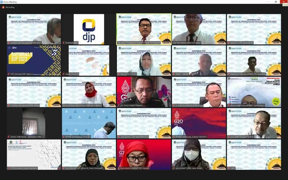 Perwakilan Kementerian Keuangan (Kemenkeu) kembali menggelar konferensi pers kinerja Anggaran Pendapatan dan Belanja Negara (APBN) Jawa Barat bulan Mei 2022 secara daring melalui Zoom Meeting di Bandung, Jawa Barat (Senin, 27/6).
